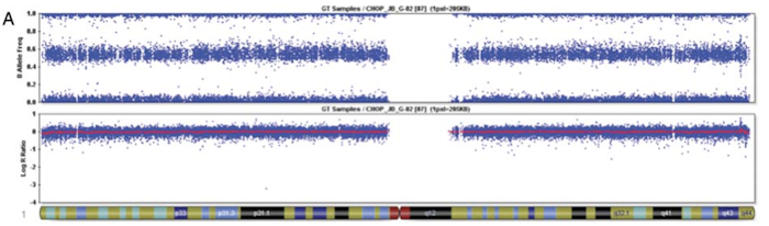 In the present study, DNA from 27 grade I and grade II pediatric gliomas, including ganglioglioma, desmoplastic infantile ganglioglioma, dysembryoplastic neuroepithelial tumor, and pleomorphic xanthoastrocytoma was analyzed using the Illumina 610K Beadchip SNP-based oligonucleotide array. Several consistent abnormalities, including gain of chromosome 7 and loss of 9p21 were observed. Based on our previous studies, in which we demonstrated BRAF mutations in 3 gangliogliomas, 31 tumors were screened for activating mutations in exons 11 and 15 of the BRAF oncogene or a KIAA1549-BRAF fusion product. There were no cases with a KIAA1549-BRAF fusion. A BRAF V600E mutation was detected in 14 of 31 tumors, which was not correlated with any consistent pattern of aberrations detected by the SNP array analysis. Tumors were also screened for mutations in codon 132 in exon 4 of IDH1, exons 2 and 3 of KRAS, and exons 2–9 of TP53. No mutations in KRAS or TP53 were identified in any of the samples, and there was only 1 IDH1 R132H mutation detected among the sample set. BRAF mutations constitute a major genetic alteration in this histologic group of pediatric brain tumors and may serve as a molecular target for biologically based inhibitors.