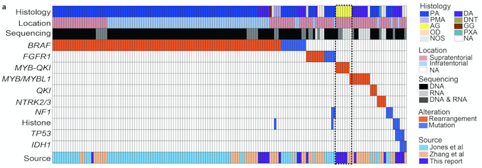 Angiocentric gliomas are pediatric low-grade gliomas (PLGGs) without known recurrent genetic drivers. We performed genomic analysis of new and published data from 249 PLGGs, including 19 angiocentric gliomas. We identified MYB-QKI fusions as a specific and single candidate driver event in angiocentric gliomas. In vitro and in vivo functional studies show that MYB-QKI rearrangements promote tumorigenesis through three mechanisms: MYB activation by truncation, enhancer translocation driving aberrant MYB-QKI expression and hemizygous loss of the tumor suppressor QKI. To our knowledge, this represents the first example of a single driver rearrangement simultaneously transforming cells via three genetic and epigenetic mechanisms in a tumor.